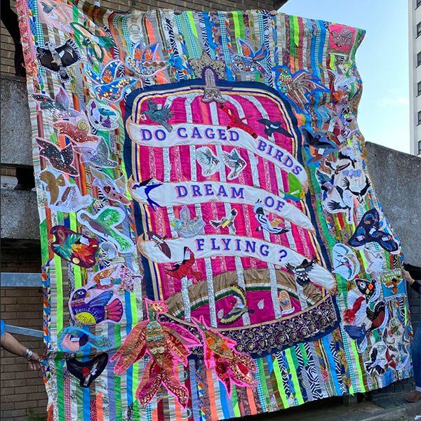 The phrase Do Caged Birds Dream of Flying, featured on this section of the Grenfell Memorial Quilt draws inspiration from Maya Angelou’s Caged Bird, in which she writes of a bird who sings “with a fearful trill, of things unknown but longed for still,” and whose tune carries “on the distant hill,” for the caged bird sings of freedom.