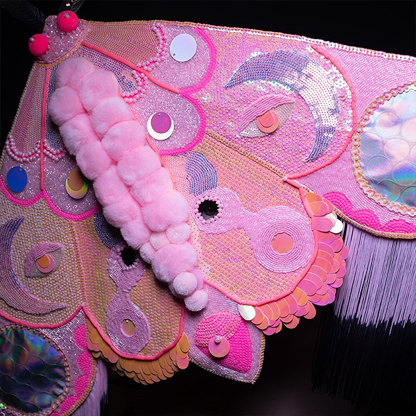 Created using her own method, a hybrid of metal mesh and wire using stumpwork techniques, each mask is intended for wear and robustly made in cotton drill and felt before being heavily embellished, each bead and sequin individually sewn by hand. Using saturated colour and materials dripping with texture, Kate is a maximalist rejecting traditional western aesthetics of mourning. As one review observed, “not only does this work suggest making the unsaid and unshown visible, but making it ultra-visible”