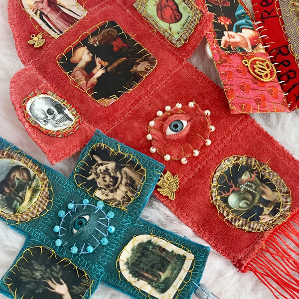I work with textiles, found objects, and upcycled materials—often gifted by those who know my love for the eclectic and the vibrant. These elements carry stories, histories, and personal meaning, which I weave into collective creations that reflect shared experiences.”