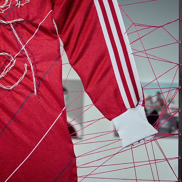 This work marks the first garment in a developing series of ‘Femorabilia’ by Jacqui, establishing new creative and scholarly approaches to documenting, celebrating and critically examining women’s contributions to football culture.
