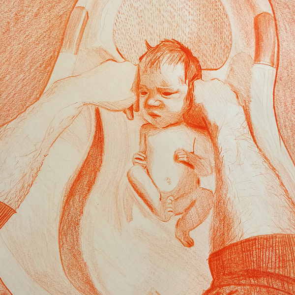 My drawings – Absent (minded) Mother are about trying to reclaim space from a time I felt I missed. They purposely only show my husband and baby and exclude me. My state of mind did not allow me to be present and the early, foggy newborn days were full of lots of phone calls/zoom meetings to the incredible perinatal team who looked after me and my family.
