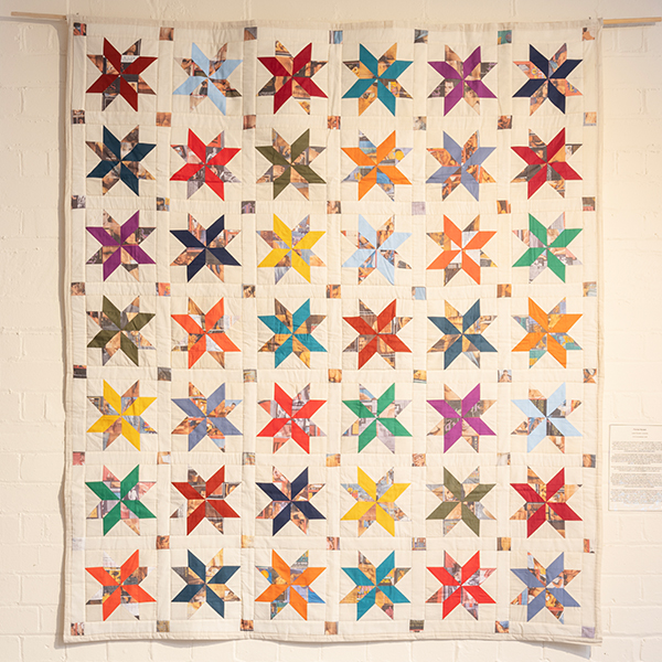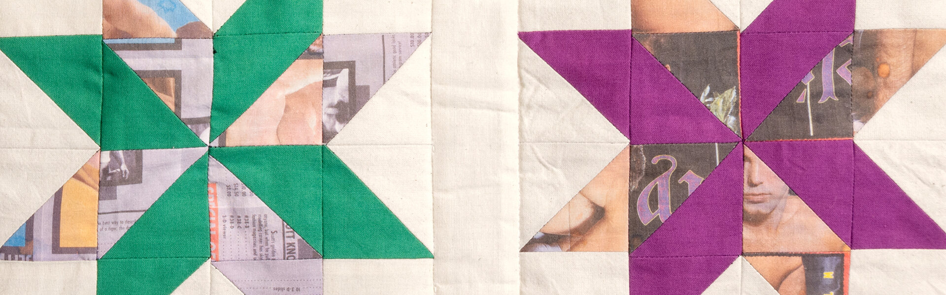 Florian Hynam’s VHS Domesticity Quilt is a full sized quilt made up of quilt blocks in a star shaped design, in multiple colours, each different colour corresponding with a different scanned image from a collection of 1980s and 90s promotional leaflets for gay pornography, available to be viewed at home. These are from the artist’s collection of vintage gay magazines and ephemera which frequently appear in his work. The images are printed onto cotton fabric and combined with block colours and undyed calico.