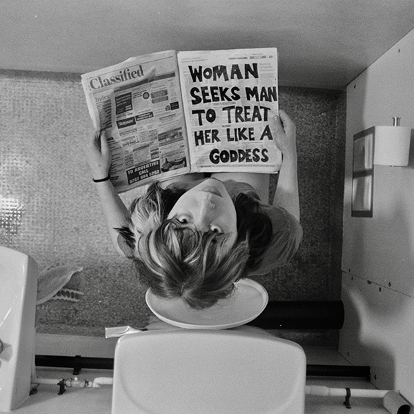 Manuela’s most recent work is a series of around thirty black and white photographs entitled ‘Looking 4 Love’. It parodies the personal ads you used to find of the classified pages of newspapers. She finds these desperately earnest in a funny, sweet way. To create the series, she painted posters and banners, writing what she was looking for in a partner and using them like a huge public dating profile. Almost all the photos are taken in and around Leeds, some are self-portraits and others photographed by friends.