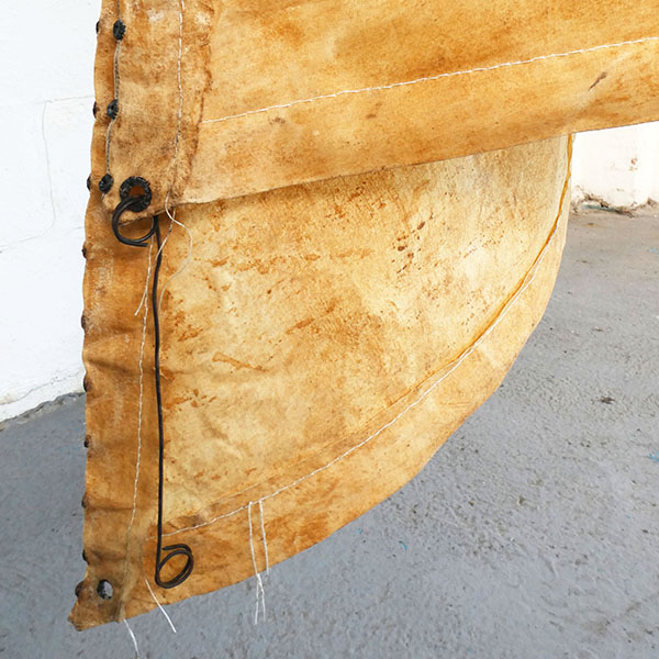 Debbie has created a sail evoking a triangular foresail. Jib uses a traditional waterproofing concoction of linseed oil, beeswax and locally found yellow ochre to preserve and colour the sail. The attachments and fittings at its edges and corners are inspired by time-honoured sail-making techniques.