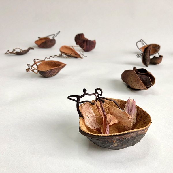 In these pieces, the tailorbirds’ sharp needle of a beak can be imagined swirling the vine thread like cotton in a seamstress’ hand, looping it through the air, piercing the dried avocado shells, pulling some together and reminding us of their origin and purpose.