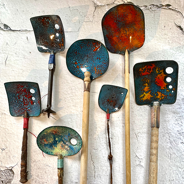 I create cutlery and tools utilising the found objects as handles. The spoons I have created for Vessel are made from copper sheet, hand cut and raised into a spoon bowl form. These are enamelled in a variety of colours made up of many layers and several kiln firings. During these processes the spoons are oxidised and polished and therefore rendered impractical for domestic use but are given a new role as a piece of decorative art that will, hopefully, prompt an emotional response.”
