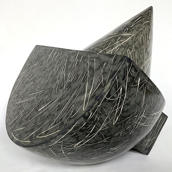 Group 1 – Forms hint at traditional shapes with taut edges and clean pot profiles. The surface mark making is assured and deliberate invigorating both form and space by deceptively simple surface patterning. Further exploration reveals a web of interlacing lines creating rich and complex visual imagery.