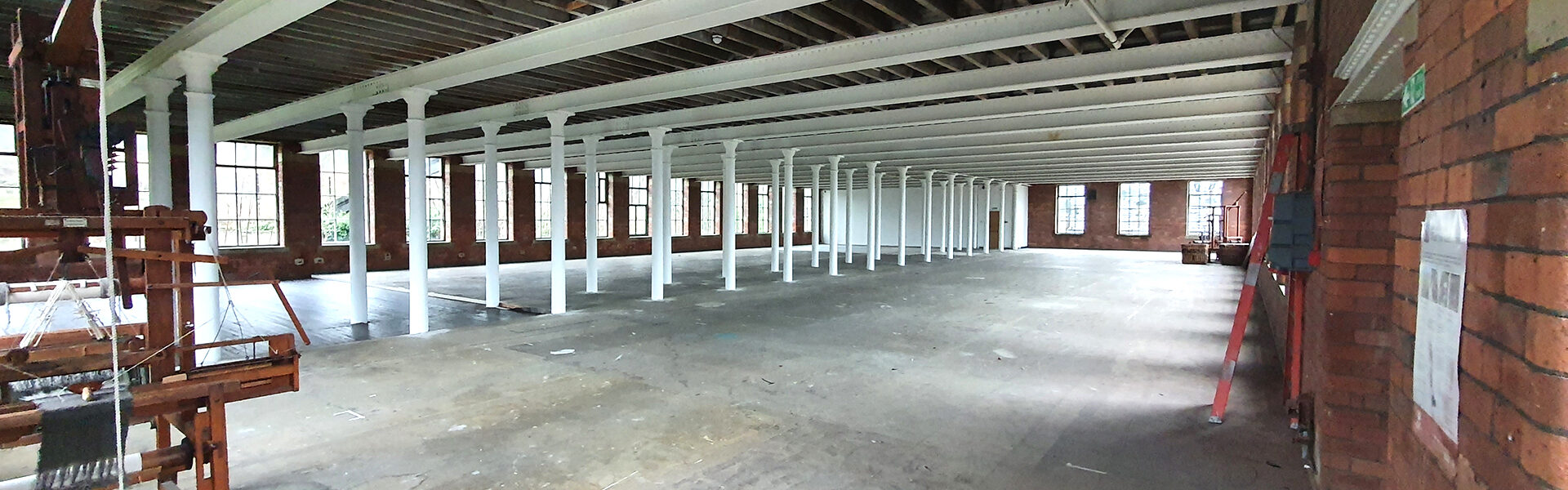 7550sqft impressive open plan mill interior, exposed brickwork with a central row of twin columns, ceiling beams and a section of feature timber floor. Large traditional windows (no blackout blinds)