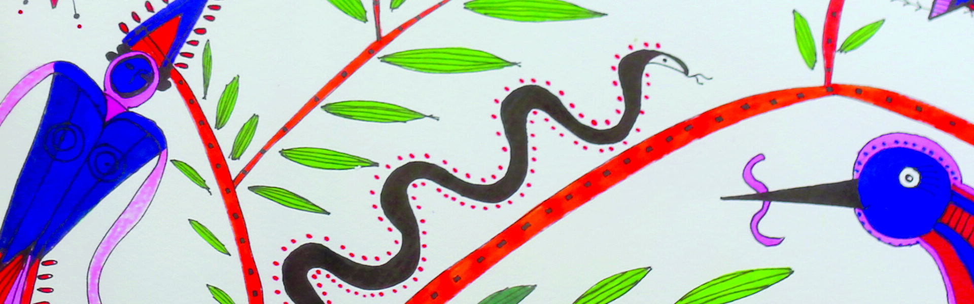 The works in this exhibition respond to the theme of play; in particular the interplay between the real and the symbolic. The artworks bring together people, creatures and patterns in free flowing worlds that present the possibility of egalitarian dreamscapes. The large work is a print of a drawing made using ultra bright, easily accessible Sharpie pens featuring motifs often found in North Indian folk embroideries.