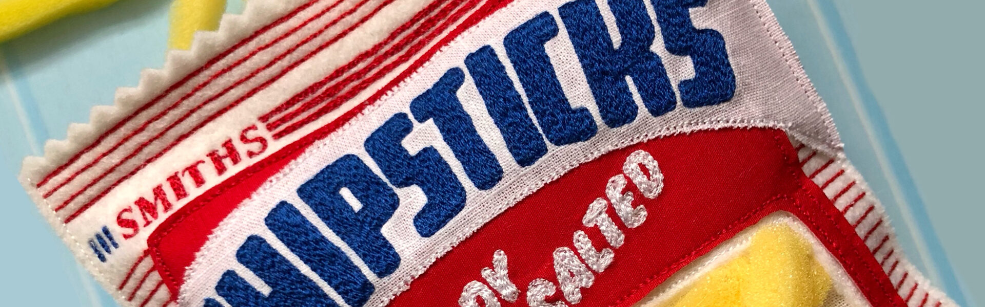 “As a craftsperson, my aim is replicate and thread paint with such accuracy and attention to detail that on first sight, it isn’t immediately obvious that one is looking at a piece of embroidery. As an artist, the hidden in plain view element of packaging is an opportunity for me to alter words and images to produce a piece of work that also holds more meaning than it might first appear. This process of ostranenie (defamiliarising objects that are very recognisable) helps us examine our assumptions and beliefs in a new way too. At times this can be to create food for thought, and other times to simply share some positivity or create something that is joyful or fun. After all, you shouldn’t play with your food… but you can.”