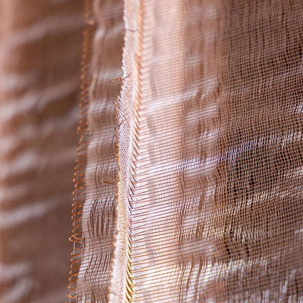 Hannah uses both traditional and unconventional materials for weaving, from wool and silk to copper and paper, manipulating material qualities to explore colour, light and space. She interested in the spatial qualities of textiles and how their quiet ubiquity makes them a potent marker of time and change. She explores the relationship between textiles and architecture: how textiles can amplify the elemental changes in environments, using the interplay of light and shadow, subtle shifts in density and texture, and the movement of cloth in air currents.