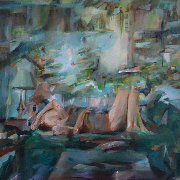 Ella is a painter, drawing on memories to create works that deeply connect with time, flux and instability of moments. Moments shift, memories change, lights flicker and suddenly we are experiencing something completely altered and fragmented. Figures emerge from layers of paint, existing in a state of flux between themselves and their collapsing dream-like environments. The layering of marks reaches disrupted abstraction through the process of trying to remember. ‘And all is always now’, (featured in Ones to Watch 2024) from T.S Eliot’s poem ‘Four Quartets’ explores the interplay of poetic language and fractured narratives and the connection between word, consciousness and intimacy.