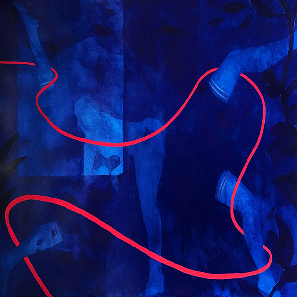 Her current work sees mysterious forms reflect the heroine’s journey towards internal healing: the descent into the underworld to reconcile with an exiled socially unacceptable shadow-self – a story that echoes through history, from Inanna to today. Clothing as symbols for liberation or repression are suggested, as watery layers of paint are sensitively applied and blotted back to create a feeling of the image breaking apart as the illusions of the ‘real’ world fall away.