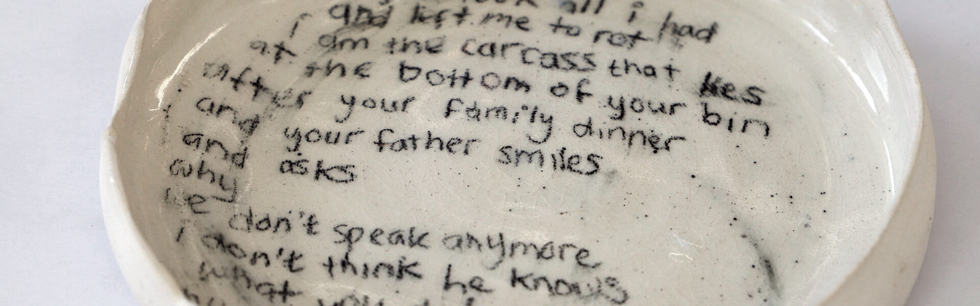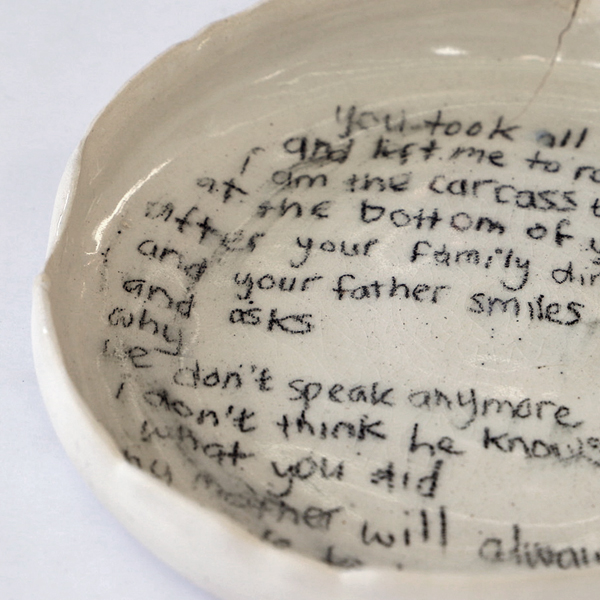 My Mother Will Always Have to Know is a ceramic piece thrown on a potter’s wheel, glazed to show a passage she has written. The passage reflects on Megan’s experience of womanhood following an abusive relationship, resulting in a court case. Whilst she was one of the few to get a form of justice, her practice acknowledges the many victims who do not and have to live in silence. Giving a voice to the voiceless is something important to her and her art practice. She went on to speak out about her experience through various news outlets and now dedicates much of her time creating artworks which spread awareness of sexual violence, following her successful art fundraiser for a charity which supported her through the court process.