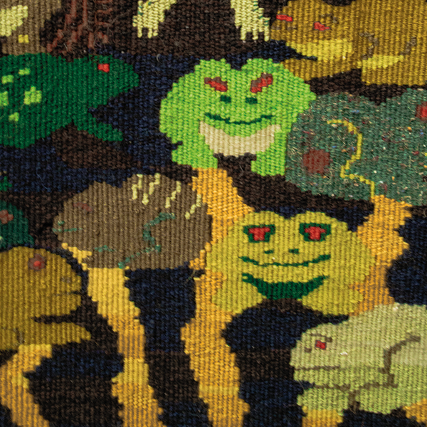 In Fallen Frogs on Pottery Lane, Sophia Roe explores relationships between animals, humans, and the environment in material culture. Process and medium are central to her work – the interconnected thread structure of weaving and the time-consuming nature of the practice create metaphorically connected meanings and provide a space in which she can reflect.