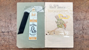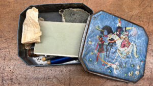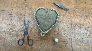 One donation that caught my attention was a blue tin box with a medieval design on the lid. Inside was a notebook titled “Out Worker Home Record Book”, accompanied by a note reading, “To Mam from Kelvin,” as well as a heart-shaped pin cushion and various needlework tools. These personal items offer a tangible link to the individual lives behind the mill to help broaden the story of the Museum & Archive collection here at Sunny Bank Mills.