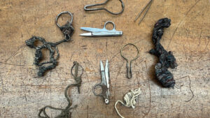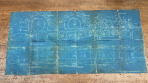Other donated items reflect the practical and technical side of mill life. A handmade pick measure crafted from an old penny, reportedly given to an apprentice by their teacher, offers a glimpse into learning and craft traditions. Additionally, a small cardboard box contained warp-twisting equipment, including various metal yarn-attached V-rings and tailoring tools that appear to be handmade, illustrating the skill and hands-on work required in the mill. Further, a blueprint of machinery offered a fascinating glimpse into the design and operation of the mill’s equipment.