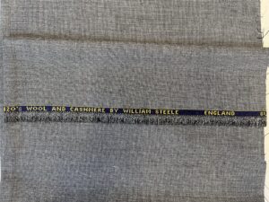 A selvedge is a ‘self-finished’ edge on a piece of fabric. ‘The term “self-finished” means that the edge does not require additional finishing work, such as hem or bias tape, to prevent fraying”. A selvedge edge provides important information for buyers of cloth. As Edwin Woodhouse cloth was produced at Sunny Bank Mills, the selvedge edge attached often included the brand name, as well as the type of fabric, the quality, and where it was produced.