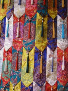 Inside Buddhist temples both in Kathmandu and far into the mountains, I discovered beautiful tubular silk hangings, called Chukor, brightly coloured with tassels which symbolise the interlocking of the different elements and directions.