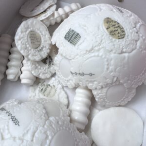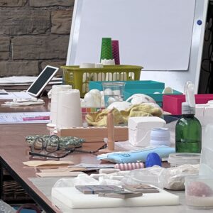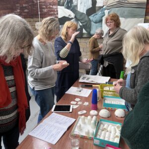 Sally spoke passionately about the Archive and demonstrated some of the processes and techniques she has used to create contemporary ceramic objects that tell a story. She is interested in the objects or artefacts and how they communicate, connect and interact with individuals and groups. After her research into objects from the Mill, she interpreted them in Parian porcelain using many ceramic processes to add to and reduce the forms and surfaces before using print techniques to build layers and narrative to the sculptural objects.